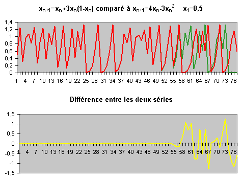 L'exemple suivant a été calculé sur un tableur standard. La même suite a été calculée en exprimant la relation entre deux termes consécutifs de deux manières différentes. Ces deux relations sont mathématiquement rigoureusement équivalentes; cependant, les inévitables erreurs d'arrondi de l'ordinateur ne sont pas totalement équivalentes, ce qui aboutit à deux suites identiques au début, mais qui n'ont plus rien à voir à partir du soixantième terme.