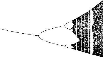 La figure obtenue s'appelle un diagramme de Feigenbaum. On voit la limite unique pour les petites valeurs de c se scinder de plus en plus vite. Cependant, on observe des intervalles de c pour lesquels le nombre de limites redevient faible, pour à nouveau se remultiplier.