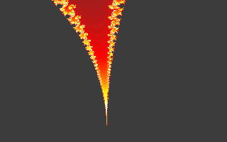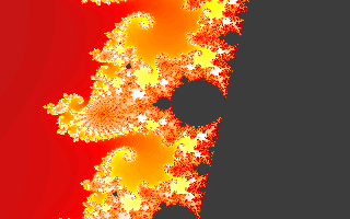 Un autre problème intéressant concernant cette suite est de regarder pour quelles valeurs complexes de c elle reste bornée. On tracera donc un diagramme avec en abscisse la partie réelle de c et en ordonnée la partie imaginaire de c. La couleur du point correspondant à c sera fonction de la rapidité avec laquelle la suite diverge, noir lorsqu'elle reste bornée.